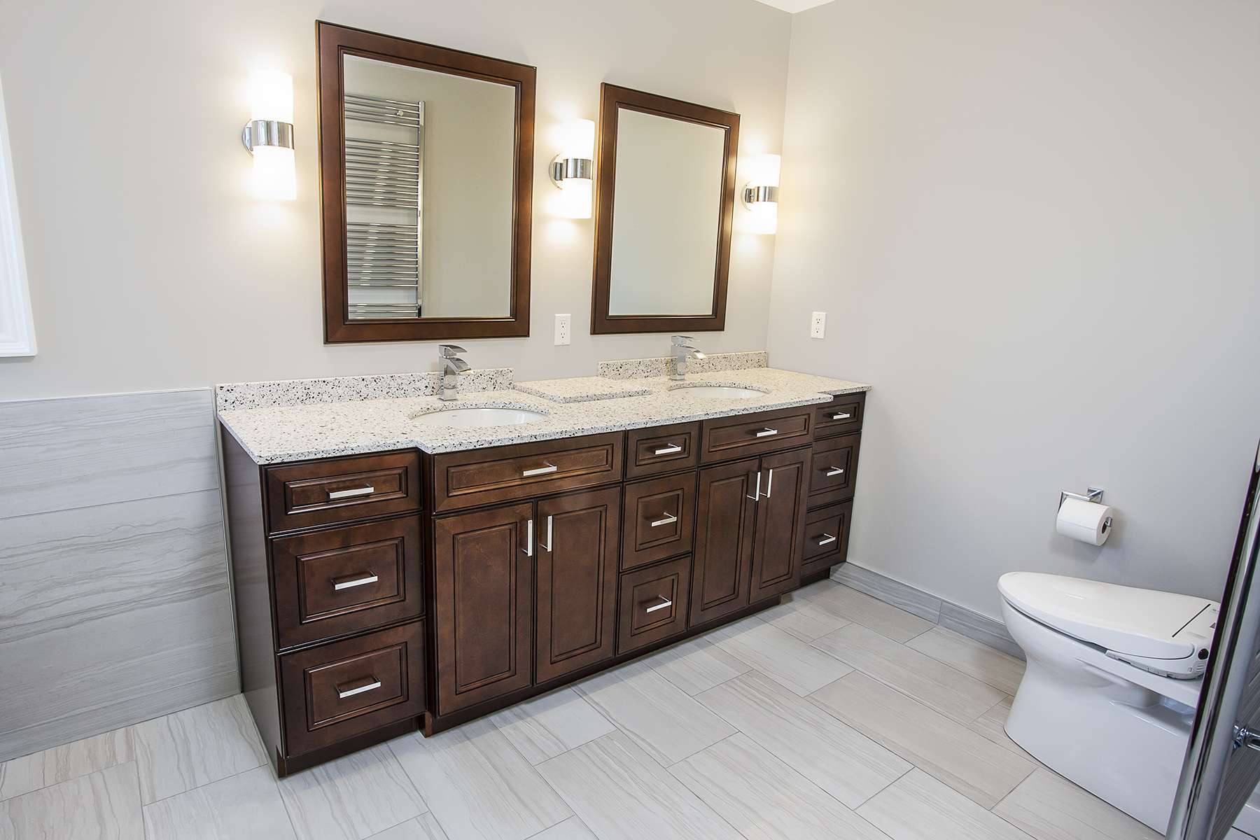 Here at Elegant Bathrooms in Stoney Creek, we understand this dynamic.  We understand that each customer, situation, and job are unique, and we work with this in mind.  First, we assess what the homeowner is able to do, things like demolition, taping and painting.  We also need to see if there are any products that have been accumulated or purchased along the way.  In this case the customer had purchased a beautiful vanity system which included countertop, sinks, upper cabinets, mirrors and moldings.  Now with our assessment finished, we can focus on the plan.