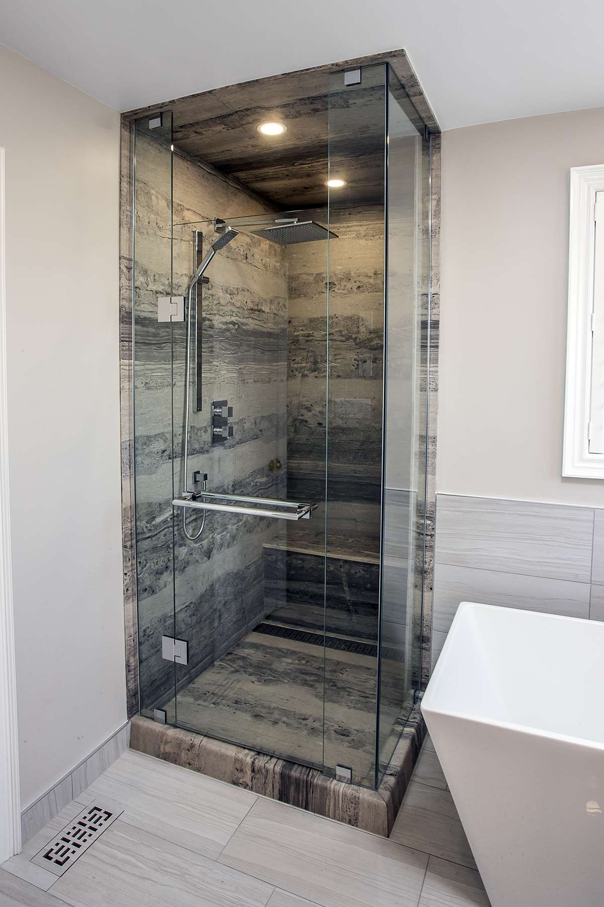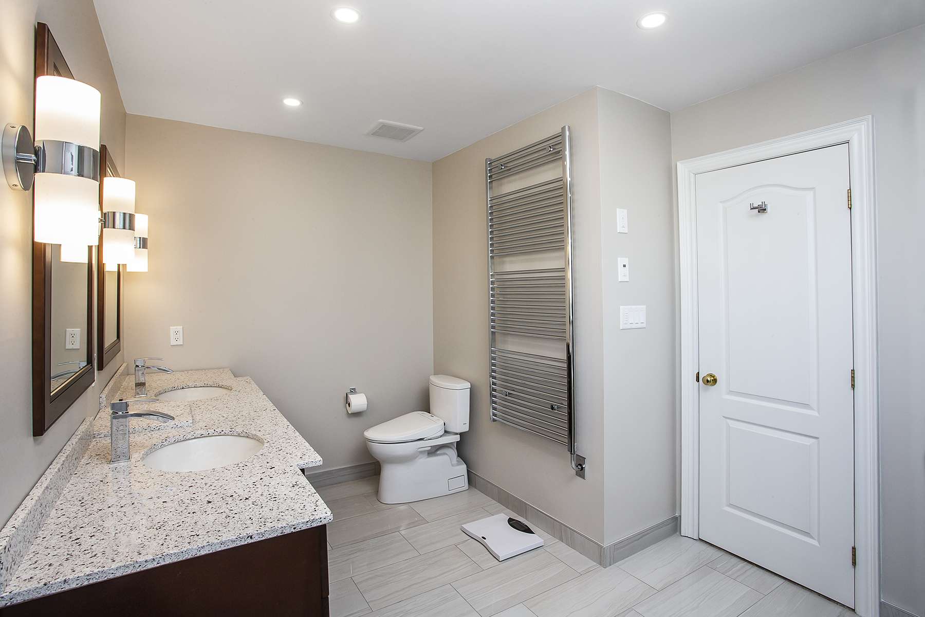 With everything configured, our Bathroom Advisor was able to help the customer fill in the gaps, not only with the fixtures and fittings, but with the renovation as well.  We picked beautiful 12” x 24” porcelain tile from FRISCO Design.  It was decided that a grout-less shower would be the best fit.  Large panels of Marbelite, with no grout lines, were used, which are available in over 100 colours.  In the shower, we went with a JL Baril square rain-shower head, as well as a hand-held system with a thermostatic shower control to maintain the same temperature every time they used the shower. Now there would be no more temperature surfing, saving time and having a wonderful shower experience every time.  We wanted to take advantage of every square inch of space, and had a beautiful custom glass shower door installed to maximize the appearance of space.