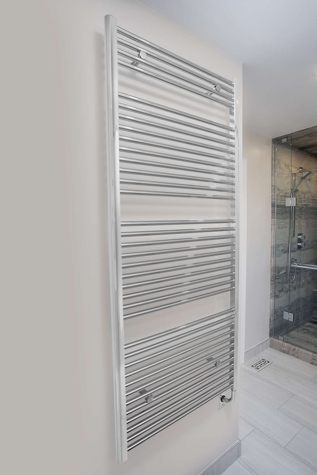 The freestanding bathtub used was a Fleurco Luna bathtub in the square finish, with a Rubi freestanding tub filler to match the design.  In order to create space for the heated towel bar, we changed the location of the bidet.  To maintain the bidet functionality, we installed a Toto toilet with washlet, which allowed us to have essentially 2 units in one, with a couple of extra creature comforts that the traditional bidet doesn’t offer, like a heated toilet seat and dryer function, to name a few.  With the money saved from doing a couple of things themselves, my clients chose to spend that money on the luxury items that fit into their lifestyle.