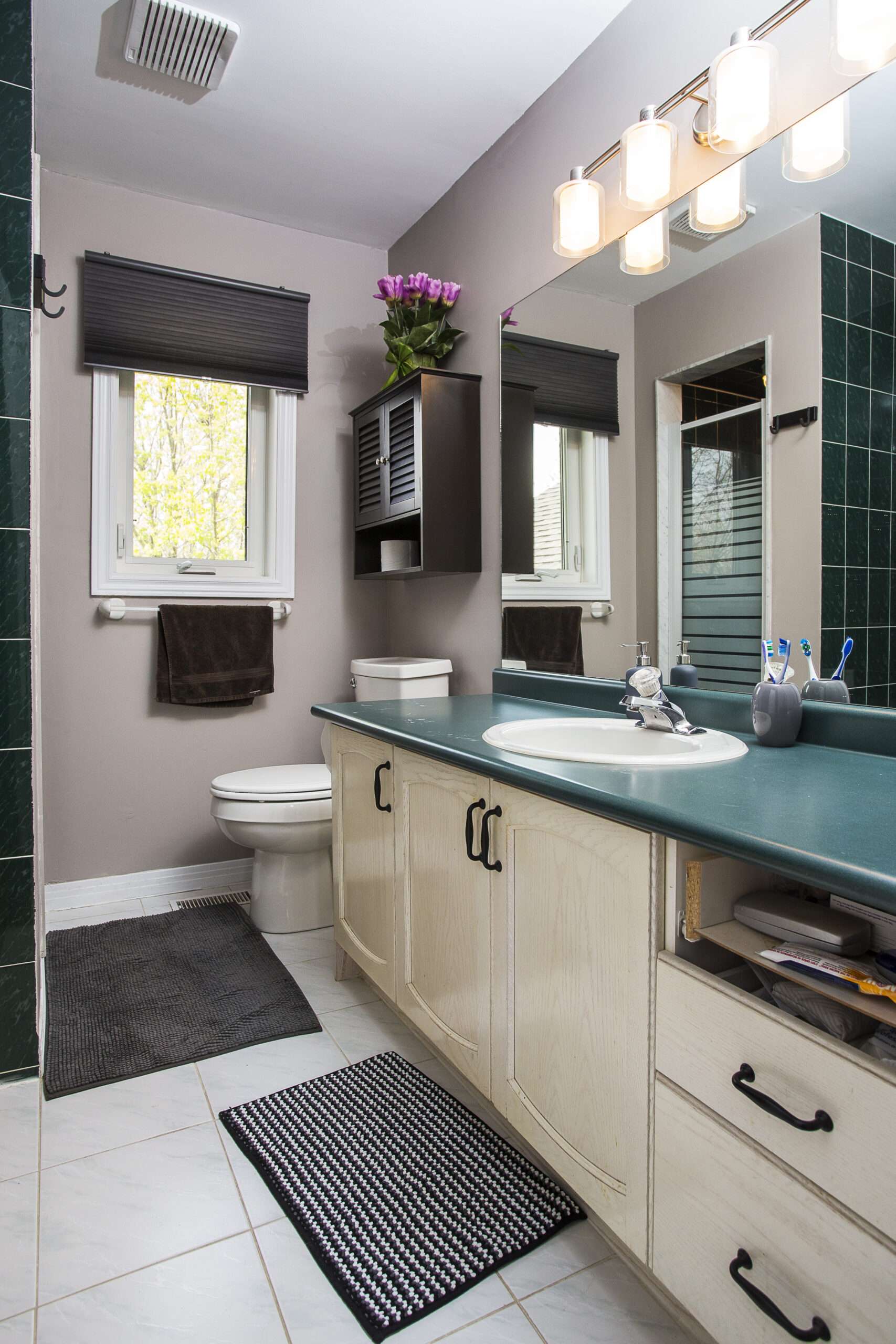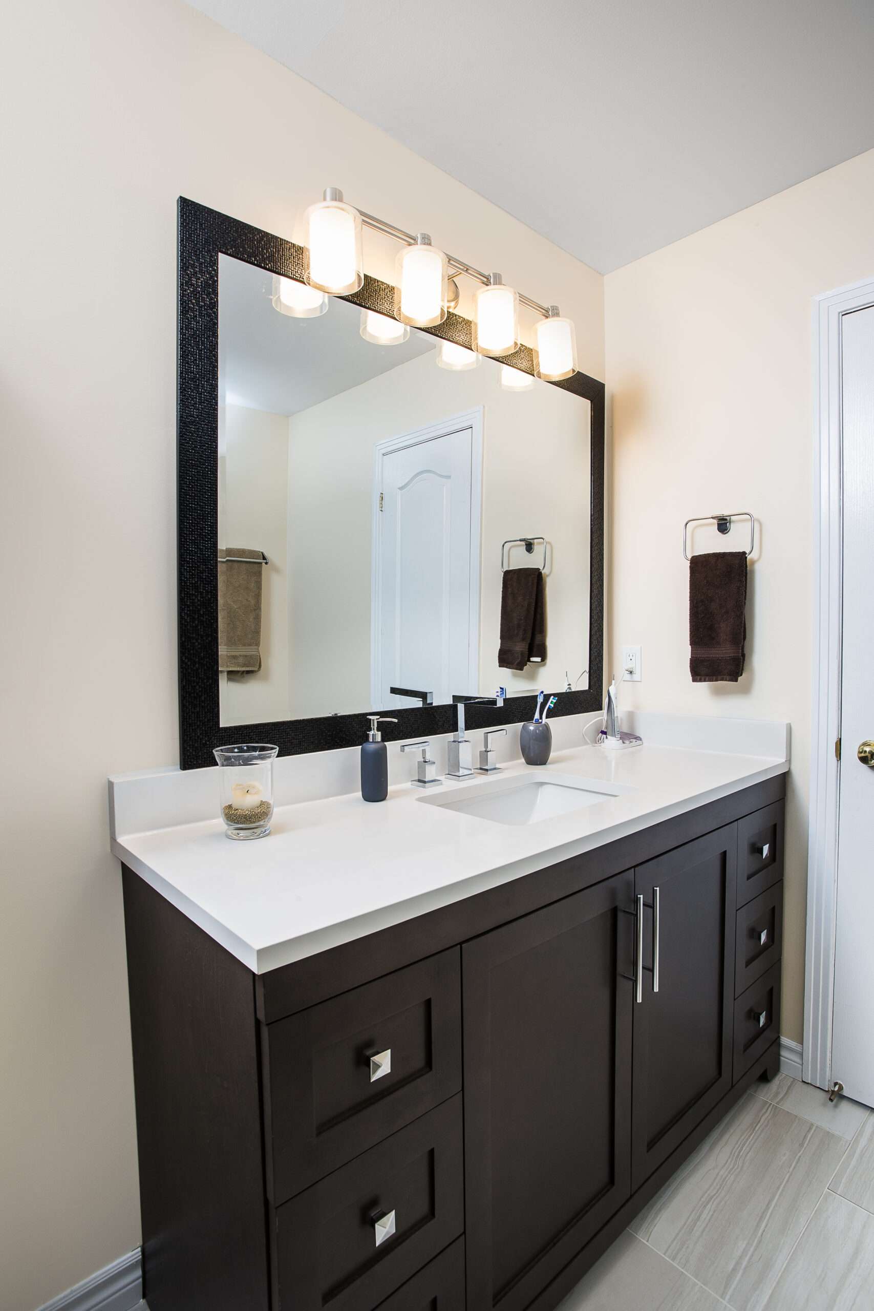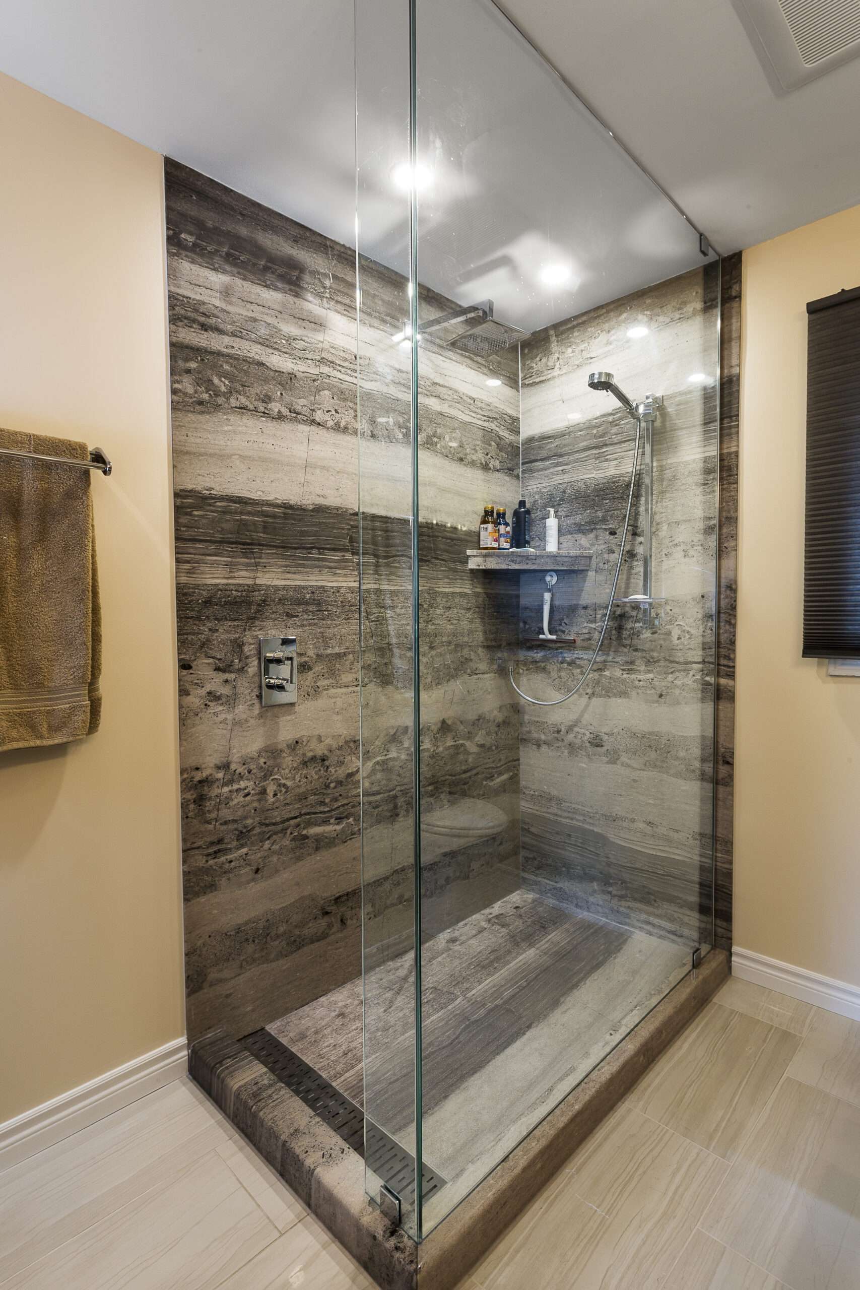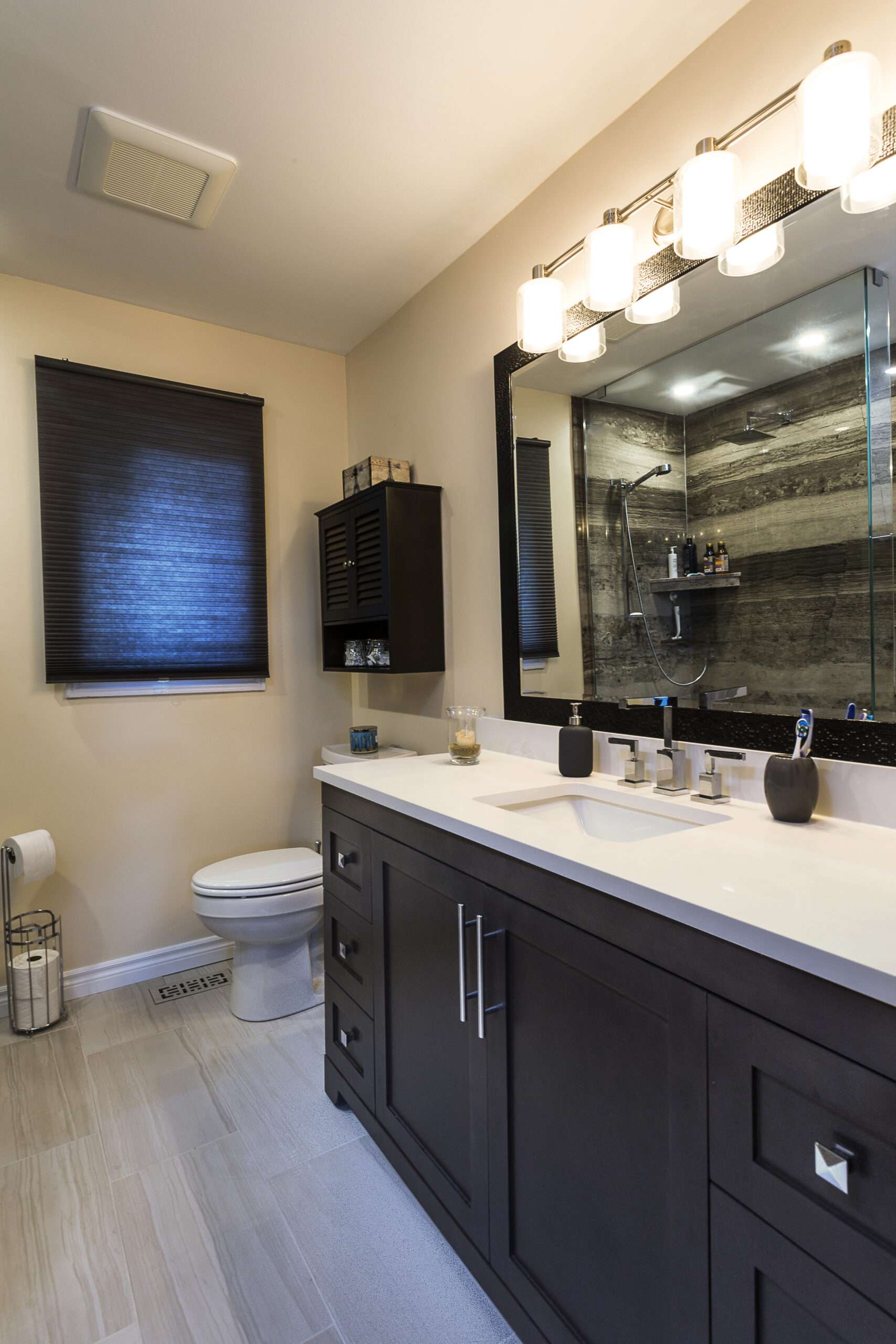 Elegant Bathrooms Stoney Creek has helped another client achieve the bathroom of their dreams! As you can see, we took this 90’s forest green style bathroom and made it elegant. We met Laura & Craig at the Hamilton Spring Home Show, and we spoke about their bathroom, and how frustrated they were with having such a small shower and a bathtub that they never used. So, after doing a site visit and discussing the situation, we met at our Stoney Creek showroom and reviewed some ideas that we thought would suit their lifestyle, and came up with an idea. Why not have a large shower without a door, which would open up the bathroom and make it spacious and spa-like. We installed a Rubi Jawa Rainshower head with hand held and matching 8” center faucet and accessories. We chose Stratus Brown Marble-ite wall panels in a high gloss to provide a grout less, seamless shower, and included a linear shower drain. The custom glass was installed to give a spa feel so you can walk right into the shower. Large porcelain tiles in a staggered 1/3 brick pattern were installed with a matching water jet.  We also cut tile for the heat register to blend into the floor and make it a seamless transition. To top it off we installed a 60” AHM vanity with a quartz countertop and under mount sink to allow for plenty of storage.
